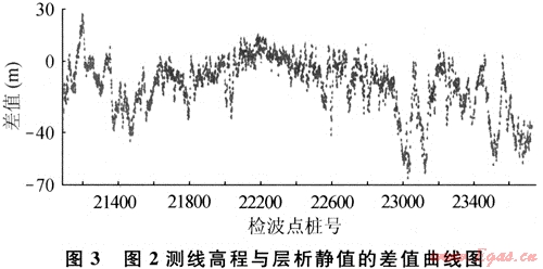 圖3是圖2測線高程與層析靜值的差值曲線。該曲線是對近地表結(jié)構(gòu)的非均質(zhì)性測量,反映出近地表結(jié)構(gòu)對地震波場的影響。可以看到,該風(fēng)化類型的靜值周期有長有短,長周期將影響構(gòu)造形態(tài),短波長將影響地震成像質(zhì)量。