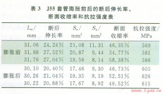 按照國標GB/T 228 2002,從膨脹前后的J55套管中各自截取3個拉伸試樣。根據金屬材料室溫拉伸標準GB/T 228--2002,試樣的原始標距根據L0=