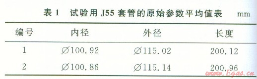 試驗中使用APl標準的J55套管(Φ=ll4.30mm,壁厚6.88 mm),其化學成分(質量分數,%)為:0.35C,0.31Si,1.39Mn,0.017Ni,0.092M0,0.19Cr,0.004S,0.014P,對兩段套管的實測原始參數如表1所示。