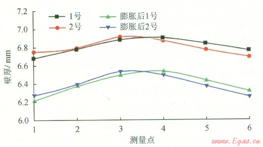 膨脹后套管的壁厚不均度會影響管材的使用性能,所以對膨脹前后管材的壁厚不均度都應該嚴格控制。APl規定套管的壁厚不均度標準在12.5%以下,而管材冷加工的經驗標準為8%【5】,應該以冷加工經驗作為膨脹管壁厚不均度的標準。