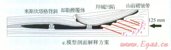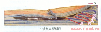 從實際地震剖面與物理模擬的結果對比圖(圖3-b、c)來看,該實驗基本將阿瓦特段的構造變形情況真實地再現了出來,物理模擬的構造形態與地震剖面基本一致:鹽下發育4排疊瓦逆沖斷層,與地震剖面一致;物理模擬剖面斷層傾角約30°,地震剖面斷層傾角40°,二者基本吻合。該實驗在邊界條件的設計上和構造變形的過程上與真實情況基本一致,符合相似性原則,可以作為對該地區構造解釋的有效證據。