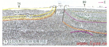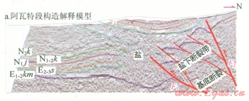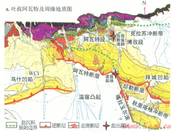 1)吐孜阿瓦特鹽下發育逆沖斷層,鹽上發育寬緩背馱向斜。分為3個帶:山前單斜帶、鹽下斷褶帶、前緣隆起帶。