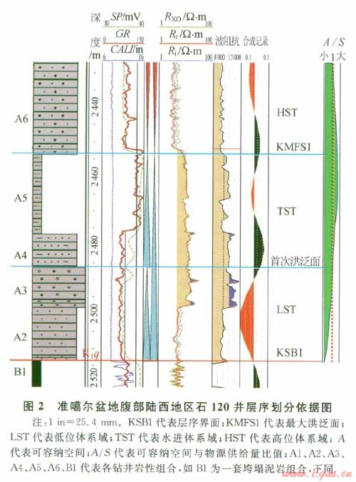 細的河道型沉積,緊鄰A3之上發育一套薄泥巖,在電阻率曲線上顯示一個明顯的低阻特征,指示首次大規模的湖進面。水進體系域以正常河流三角洲沉積(A4)體系為主,隨后發育了以粉砂巖為主的砂泥巖薄互層沉積(A5),顯示湖平面上升早中期的垂向加積為主的沉積特征,在A5之上發育薄的質純高伽馬值泥巖,指示最大湖泛面位置KMFS1(也是一個下超面和視不整合面),上覆高含砂率的巖性組合(A6)指示高位體系域的進積沉積體系[3]。
