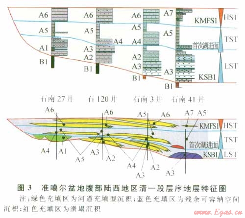 如圖3在石南3井A3之上的一段薄相對低阻泥巖的發育,標志著水進體系域的開始,以一系列的退積式疊置方式為主。值得注意的是,在湖進面開始的早期,由于湖平面局限在斜坡和凹陷的轉換部位,即湖平面處于相對的停滯期,在此期間物源的供給雖然相對低位體系域大幅度減少,但由于此時可容納空間的分布范圍較小,故石南3井的物源供給相對充足,沉積了退積疊置關系的2套中細砂巖體。但隨著物源供給的逐漸減少和湖平面越過凸凹轉換部位,湖平面開始迅速地大面積分布,砂巖體沉積迅速減少(A4,石120井、石南3井)。所以在水進體系域主要發育上超尖滅型的巖性圈閉(石南27井)。在某些受局部古地貌低部位控制的地方,由于存在地震等事件和可能存在的水進體系域中沿岸線分布(凸凹轉換部位)的波浪淘洗雙重作用下,A3可能被部分侵蝕而發育滑塌沉積(圖3,紅色充填區域),這是目前清水河組油氣藏的主要勘探圈閉類型,石南31井區清水河組油氣藏即為此類型圈閉。