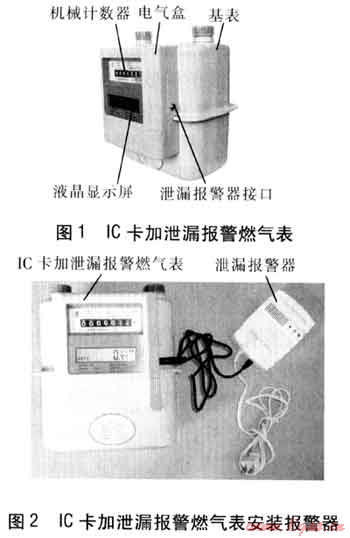 IC卡加泄漏報警燃氣表由基表(也稱機械燃氣表)、計量傳感器、電機閥門、電子控制器(包括主控線路板和電氣盒)4部分組成,是具有預付費功能的燃氣計量裝置,具有精確記數功能、數據交換功能、電機閥門自動控制功能、非法操作處理功能、欠壓處理功能、掉電保護功能、數據液晶顯示與報警聲音提示功能等。其管理系統采用模塊化程序設計,界面友好,操作簡單。與普通IC卡燃氣表不同的是,它可以連接不同廠家的泄漏報警器,具有室內燃氣泄漏超標時報警并關閉表內電機閥門,切斷氣源的功能。