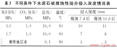 表3是根據腐蝕后水泥石顏色的變化,采用體視顯微鏡觀察并測試腐蝕性組分侵入水泥石深度的試驗數據。