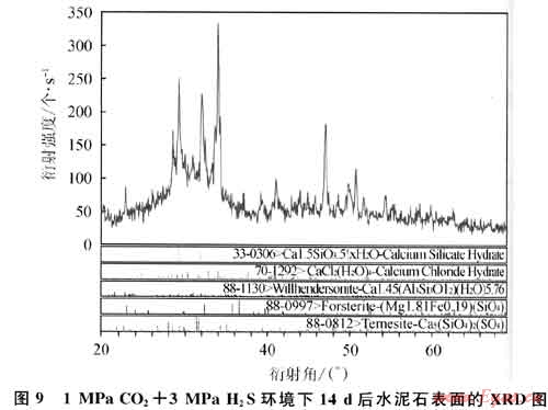 圖8、9是1MPa C02+3MPa H2S環境下水泥石界面腐蝕7d和14d后X射線衍射成果圖(XRD)。