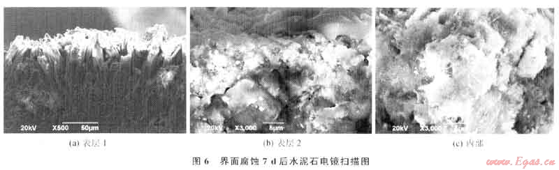 由顯微照片圖6-a可以看到腐蝕后的水泥石表面包裹著一層腐蝕產物,由掃描電鏡(sEM)看出該包被層屬于致密性的。在致密包被層的下面是水泥石的內部結構,由圖6、7對比看出,腐蝕后的水泥石內部結構相對致密層來說較為疏松,能觀察到部分較大的孔洞,這些孔洞可能是腐蝕介質和水泥石中的水化產物反應留下的,同時反應的腐蝕產物通過孔洞和凝膠孔等被運移到水泥石的表面,最終使水泥石的表面形成致密包被層。