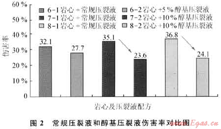 室內對研制的醇基壓裂液性能進行實驗評價,結果表明:①醇基壓裂液的表面張力低于26mN/m,低于水基壓裂液;②防膨率在80%以上,優于水基壓裂液;③殘渣含量為462mg/L,低于550mg/L的行業標準;④用K2X井巖心實驗醇基壓裂液的傷害率在23.65%~27.7%之間,而水基壓裂液的傷害率在32.1%~36.8%之間,可見醇基壓裂液傷害率比常規壓裂液降低幅度約1/3(圖2);⑤甲醇的加入有利于降低壓裂液的表面張力和黏度,從而有利于壓裂液施后的返排,降低了壓裂液對儲層的傷害。