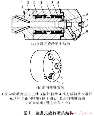 自進式旋轉射流解堵工藝的關鍵設備為自進式旋轉噴頭,其結構見圖1。