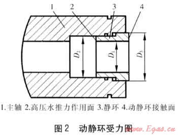 摩擦阻力矩產生在密封靜環和密封動環的接觸面上,摩擦阻力矩的大小與密封靜環和密封動環的材質、加工精度、接觸面端面壓力等有關。動靜環受力圖見圖2。