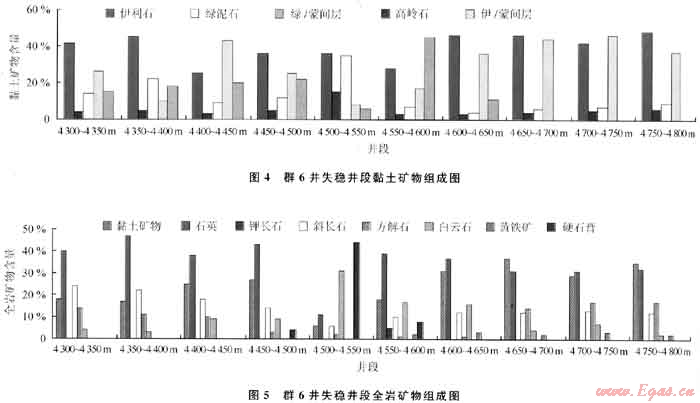 由圖5可以看出,群6井失穩(wěn)井段的全巖礦物以石英(相對(duì)含量介于11%~47%)、黏土礦物(相對(duì)含量介于6%~37%)、斜長(zhǎng)石(相對(duì)含量介于6%~24%)、方解石(相對(duì)含量介于1%~17%)、白云石(相對(duì)含量介于3%~31%)為主,還含少量的鉀長(zhǎng)石、石膏和黃鐵礦,缺失方沸石、菱鐵礦和鹽巖。同時(shí)處于4500~4550m井段的地層硬石膏相對(duì)含量較高,達(dá)到了44%,屬石膏泥巖層,當(dāng)鉆井過程中鉆遇到該地層時(shí),鉆井液液柱壓力不能平衡地層坍塌壓力,地層在地層坍塌壓力作用下向井眼擠壓,或者鉆井液中抗鹽抗鈣處理劑加量不足,使石膏吸水膨脹、分散,從而造成井下坍塌、掉塊、卡鉆等鉆井復(fù)雜事件。