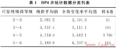 研究分析地層物性條件對水平井井眼軌跡的影響規(guī)律,至少需要解決2個問題:①地層物性條件的標(biāo)識問題,即如何將地層的各種物性特征按照統(tǒng)一標(biāo)準(zhǔn)歸類、分級;②如何建立地層物性條件與井眼姿態(tài)參數(shù)(井斜角、方位角)的對應(yīng)關(guān)系。其中,地層物性條件的標(biāo)識問題可以從眾多的地層可鉆性分級方法中優(yōu)選;而對于第二個問題則可以利用統(tǒng)計(jì)分析的方法建立某一區(qū)塊特定鉆具組合在復(fù)合鉆進(jìn)方式下的鉆進(jìn)特性與地層物性的統(tǒng)計(jì)關(guān)系予以解決。