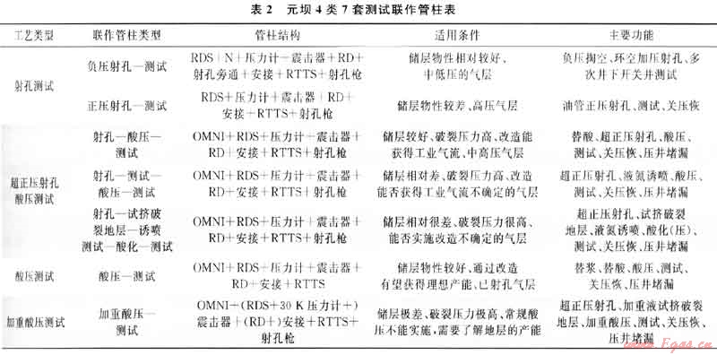 利用地震、鉆井、錄井、測井等資料,在研究區域構造、砂體展布、地層壓力及溫度、含油氣情況、儲層特征等基礎上,針對不同的測試目的,形成了以“超正壓射孔酸壓測試技術”[4]為核心的4類7套優快APR測試技術(表2)。對深度大于6000m的氣井,改造管柱需增加2組伸縮短節。