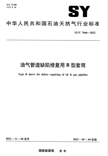 油氣管道缺陷修復用B型套筒SY/T 7666-2022 :本文件規定了 L485/X70 及以下鋼級 B 型套簡的設計及制造,試驗及檢驗,外觀檢驗,無損檢測、標識,產品質量證明文件,包裝、運輸和使用等。