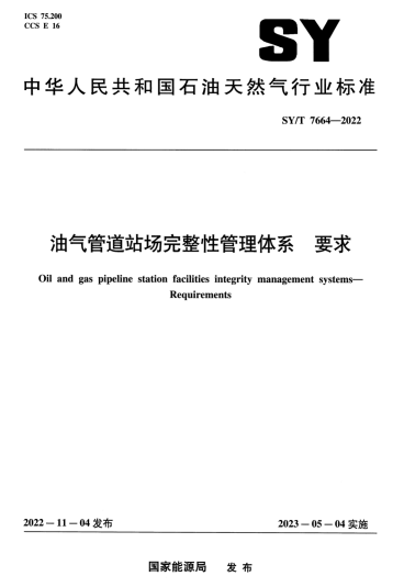 SY/T 7664-2022 油氣管道站場完整性管理體系 要求:本文件規定了油氣管道站場構建完整性管理體系的基本要求,用于指導企業建立站場完整性管理體系,實施完整性管理工作,提高設備設施安全性,可靠性、經濟性運行水平,持續改進管理績效。