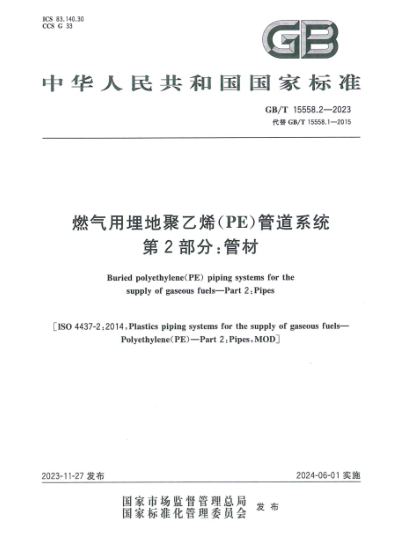 燃?xì)庥寐竦?a href=http://m.yd987.com/e/tags/?tagname=%E8%81%9A%E4%B9%99%E7%83%AF target=_blank class=infotextkey>聚乙烯(PE)管道系統(tǒng) 第2部分:管材GB/T 15558.2-2023